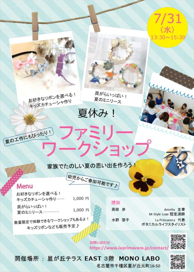 夏休みも10日が過ぎましたね! 梅雨も明けて、暑い毎日 みなさんいかがお過ごしですか(^^) 子供達との過ごし方のご提案♡ 親子で、家族で参加できるワークショップを名古屋・星が丘にて開催します✨ ☆日時 7…